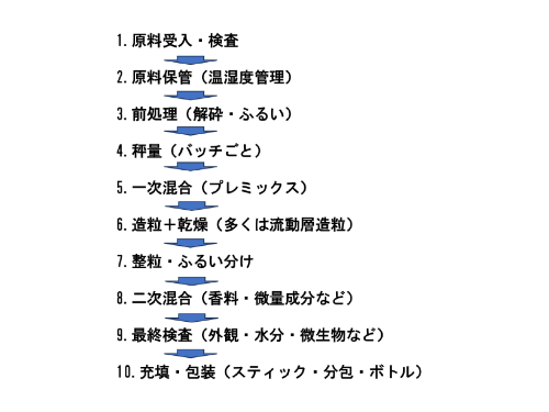 - 原料受入 → 貯蔵 → 切り出し → 輸送 → 計量 → 主単位操作(粉砕・混合など) → 集塵 → 充填・包装…